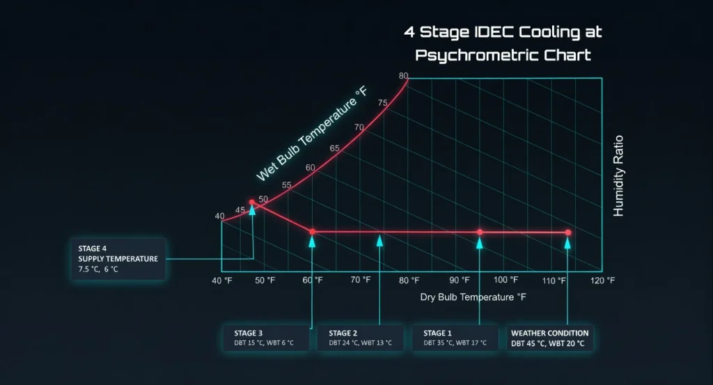 Indirect-direct evaporative cooling (IDEC) system - Four stage adiabatic cooling.